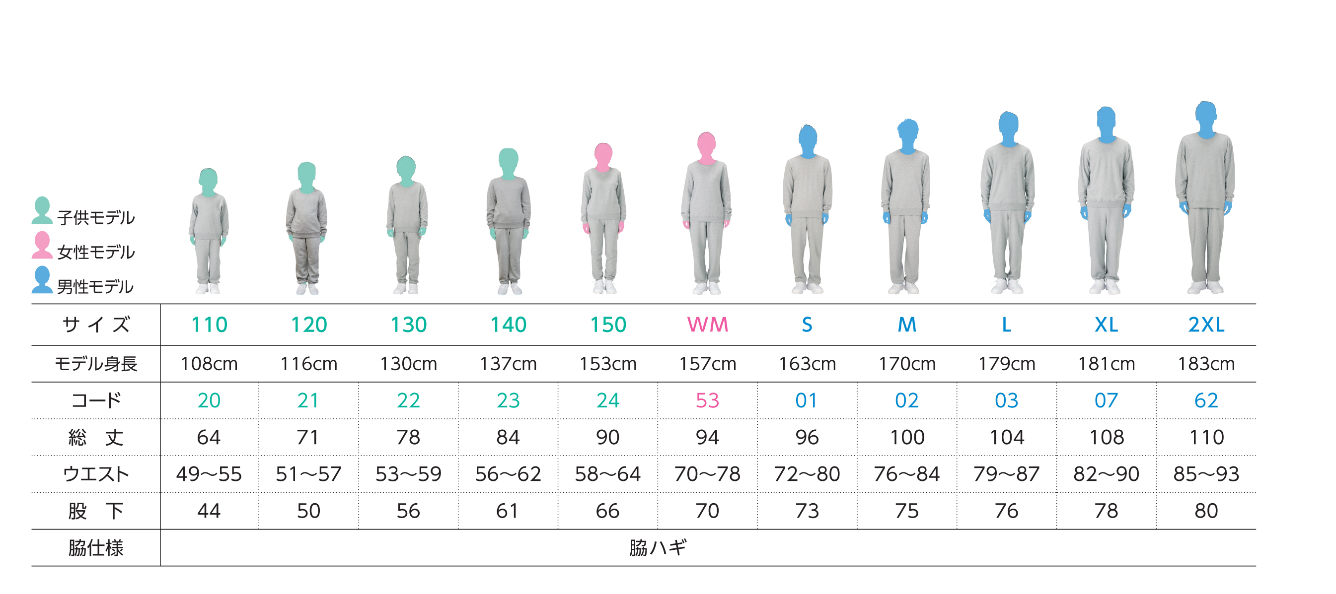 | 110 | 120 | 130 | 140 | 150 | WM | S | M | L | XL | 2XL | |